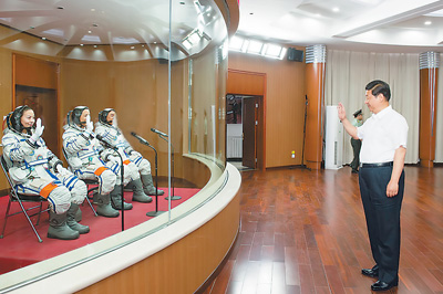 ?。保比罩形?,習(xí)近平在酒泉衛(wèi)星發(fā)射中心聽(tīng)取了天宮一號(hào)與神舟十號(hào)載人飛行任務(wù)有關(guān)情況匯報(bào)。習(xí)近平充分肯定各參研參試單位和部門為完成神舟十號(hào)載人航天飛行任務(wù)所做的大量準(zhǔn)備工作。習(xí)近平說(shuō),這次任務(wù)飛行時(shí)間長(zhǎng),試驗(yàn)難度大,面臨一系列新的挑戰(zhàn)和考驗(yàn)。希望同志們牢記使命、堅(jiān)定信心、周密組織、科學(xué)實(shí)施,確保實(shí)現(xiàn)既定的任務(wù)目標(biāo),努力奪取載人航天事業(yè)發(fā)展新勝利。