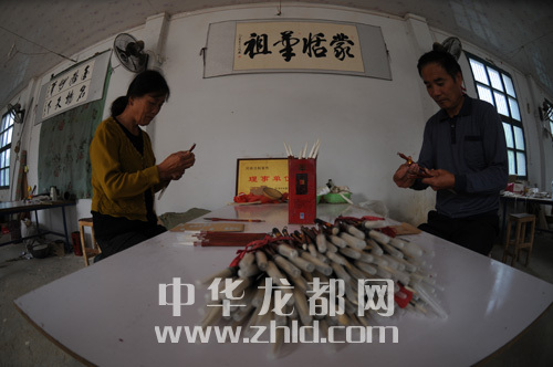 ????提起汝陽劉毛筆,劉四平滔滔不絕?!叭觋杽⒚P選料考究,兔毫的選擇標(biāo)準(zhǔn)是秋毫取健,取尖,春夏毫則不要;狼毫必須要到東北去采集過冬的黃鼠狼尾毛來制作?!闭勗掗g,劉四平順手拿起一支毛筆,說:“汝陽劉毛筆制作很精細(xì),主要工藝流程有:分毛-脫脂-去絨-裝毛-齊毛-墊毛-切毛-梳毛-修毛-成頭等128道工藝,成品具備尖、圓、齊、健‘四德’,軟硬適中的標(biāo)準(zhǔn);其外飾,尤其是筆桿的裝飾極為講究,根據(jù)筆的形狀和高、中、低檔的要求配之,既美觀又大方?!?/p>