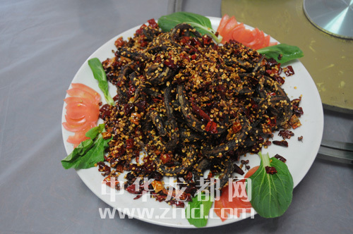 ????到了孫店鎮(zhèn),不吃“干煸盤龍鱔”是種遺憾。這里的“干煸盤龍鱔”不僅選料考究,而且做工精細(xì)。鱔魚必須選擇顏色呈黑褐色的天然生黃鱔,辣椒以紅色為宜。做法要經(jīng)過泡、燙、炸、煸炒等工序。“干煸盤龍鱔”具有極高的營養(yǎng)價值和藥膳作用?!袄倍荒?、麻而可口!”記者品嘗了剛做好的“干煸盤龍鱔”,發(fā)現(xiàn)風(fēng)味果真獨(dú)特。