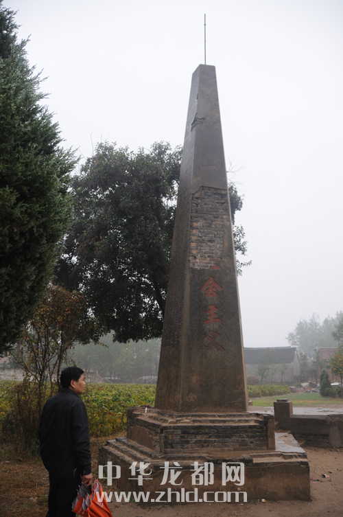 ????在秋雨中,我們走進(jìn)陵頭崗村北頭的普理小學(xué),這是所普及革命真理的紅色校園。在青松和古柏的映襯下,校園操場中央矗立的三崗革命根據(jù)地紀(jì)念塔顯得更加莊嚴(yán)肅穆,塔身正面刻寫著“為了革命事業(yè)的勝利,英勇犧牲的英雄們千古不朽”21個大字,塔身背面的字跡雖然已經(jīng)模糊,但仔細(xì)辨認(rèn)還能看到這樣一段話:“河南省老根據(jù)地建設(shè)委員會為了培養(yǎng)老區(qū)人民的后一代,使其繼承革命事業(yè)的優(yōu)良傳統(tǒng),成為社會主義的建設(shè)者和保衛(wèi)者,乃于一九五六年撥發(fā)款項修葺擴(kuò)建三崗小學(xué),欣值落成用特志其端末,以資留念,時在一九五七年十月?!边z憾的是,由于年久失修,塔身西北側(cè)上半部已經(jīng)風(fēng)化,刻寫的“一切為了社會主義”8個大字只剩下“一”“會主義”4個字,覆蓋在塔身中部外層的水泥已經(jīng)脫落,露著磚塊。據(jù)69歲的村民侯民生介紹,1957年10月,普理小學(xué)從陵頭崗村舊址搬遷到此后進(jìn)行了擴(kuò)建,不僅蓋起了當(dāng)時全縣一流的校舍,還在校園正中心建起了這座紀(jì)念塔。