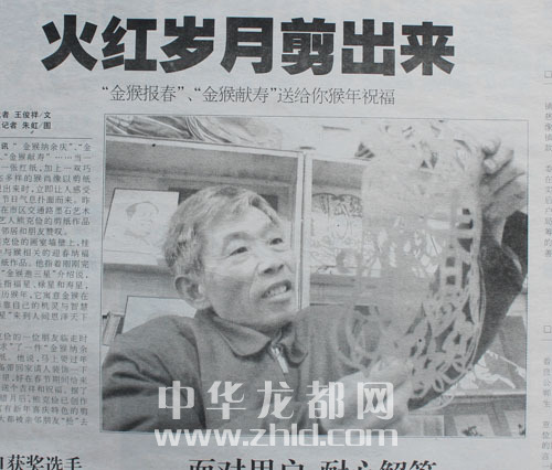 ????2003年底,周口晚報(bào)記者王俊祥在參加一個(gè)朋友的飯店開(kāi)業(yè)時(shí),偶然發(fā)現(xiàn)眾多禮品中有一幅貼在玻璃上的手工剪紙作品很是吸引眼球。通過(guò)打聽(tīng),得知這是熊克儉的作品。于是,王俊祥和攝影記者朱虹一起來(lái)到熊克儉家,在喜迎猴年之際,采寫(xiě)了圖文并茂的消息《火紅歲月剪出來(lái)》。