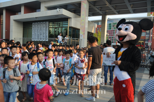????9月1日17時許,在慶豐路周口市文昌小學門前,家長們看到周口晚報工作人員在派發(fā)禮品,紛紛掏出手機,掃描二維碼關注周口晚報微信公眾號(圖一)。17時40分,放學的孩子們排著整齊的隊伍陸續(xù)走出校門。校門外,由周口晚報記者扮演的米老鼠和唐老鴨“大玩偶”吸引了孩子們的目光(圖二)。孩子們興奮地同“大玩偶”玩耍起來。有玩的,還能免費領取學習用品,孩子們大聲召喚家長加入到掃描二維碼關注周口晚報微信公眾號的“大軍”中來。市民趙先生說:“我是咱晚報的忠實讀者,正準備訂閱明年的報紙,還打算讓孩子參加晚報組織的小記者活動呢!”