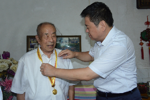 圖為市委書記徐光為抗戰(zhàn)老干部張明鐸佩戴中國人民抗日戰(zhàn)爭勝利70周年紀(jì)念章。記者 王映攝