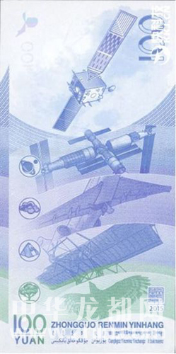 中國航天紀(jì)念鈔面額為100元,票面長155毫米,票面寬77毫米,中國航天紀(jì)念鈔主色調(diào)為藍色。正面主景圖案為神舟九號飛船與天宮一號交會對接圖案。左上方為國徽圖案、“中國人民銀行”行名,其下方為東方紅一號衛(wèi)星圖案。票面左下方為面額數(shù)字“100”和漢字“壹佰圓”。主景圖案右側(cè)為嫦娥一號衛(wèi)星圖案,其上方為面額數(shù)字“100”和“中國航天紀(jì)念”字樣。背面主景圖案由上至下依次為嫦娥一號衛(wèi)星圖案、2020年中國空間站“天宮”、噴氣式客機、馮如2號雙翼螺旋槳飛機、飛禽海東青圖案。票面左上角為風(fēng)箏局部圖案,右上角為面額數(shù)字“100”。票面下方為行長章與年號“2015”,中國人民銀行漢語拼音字母和蒙、藏、維、壯四種民族文字的“中國人民銀行”字樣與面額,面額數(shù)字“100”,漢語拼音字母“YUAN”。