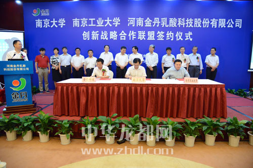 ????本報(bào)訊(記者 李莉) 7月9日上午,南京大學(xué)、南京工業(yè)大學(xué)、河南金丹乳酸科技股份有限公司創(chuàng)新戰(zhàn)略合作聯(lián)盟簽約儀式在鄭州舉行。副省長(zhǎng)張維寧,中國(guó)工程院院士張全興,南京大學(xué)副校長(zhǎng)談?wù)苊?,南京工業(yè)大學(xué)副校長(zhǎng)喬旭,省科技廳廳長(zhǎng)張震宇,市委書記、市人大常委會(huì)主任徐光,省環(huán)保廳副廳長(zhǎng)師偉,市委常委、常務(wù)副市長(zhǎng)劉保倉(cāng),市委常委、組織部長(zhǎng)靳磊,副市長(zhǎng)王田業(yè),及鄲城縣主要領(lǐng)導(dǎo)、河南金丹乳酸公司主要負(fù)責(zé)人出席簽約儀式。