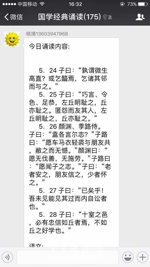 ????建立該微信群的是團(tuán)市委工作人員劉曉靖。劉曉靖告訴周口晚報(bào)記者,建立該微信群的目的是想讓大家多讀讀國學(xué)經(jīng)典,增加大家的文學(xué)涵養(yǎng),讓大家養(yǎng)成讀書的習(xí)慣。“剛開始只有十幾個(gè)人,大家有些不好意思,有的人覺得自己讀得不好張不開口,我就做一些示范,引領(lǐng)大家誦讀。不久,加入微信群的人多了,通過幾個(gè)人帶動(dòng),大家誦讀的就多了。”劉曉靖說,讀的方式就是大家通過微信的語音功能,讀一些《論語》中的經(jīng)典句子。過了一段時(shí)間,大家對(duì)這種方式越來越認(rèn)可,加入該微信群的人也越來越多,人數(shù)從剛開始的十幾個(gè)人增加到近200人?,F(xiàn)在,該微信群里不但有電臺(tái)、電視臺(tái)的專業(yè)主持人,而且有一些學(xué)者。以前拿不準(zhǔn)的字,現(xiàn)在都會(huì)有人講解,大家也有了學(xué)習(xí)對(duì)象。這個(gè)微信群從成立到現(xiàn)在,《弟子規(guī)》、《大學(xué)》、《中庸》、《論語》已讀一遍,四書里面只剩下《孟子》還沒有讀。