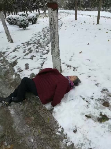 ????11月23日早上,大雪過后的周口銀裝素裹。在一家教育培訓(xùn)機構(gòu)上班的老師單啟航像往常一樣來到周口中心城區(qū)濱河公園晨練。7時許,單啟航在濱河路(市中心醫(yī)院北面)看到一位上了年紀(jì)的老大娘躺在雪地上,一臉痛苦。