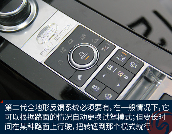 第二代全地形反饋系統(tǒng)必須有,它的特點是在任何非AUTO模式下,且車速低于50公里/時,車身會自動升高75毫米,以此應(yīng)對復(fù)雜越野需求。而全地形反饋系統(tǒng),同時能夠提升車輛的發(fā)動機(jī)、變速箱、中央差速器和底盤的性能,使駕駛者可以根據(jù)具體地形選擇合適的駕駛模式。