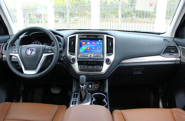 長安CS95采用大尺寸顯示屏搭配實體按鍵,兩側豎向設置了空調(diào)出風口,按鍵排布層次分明,但略顯繁雜。新車還配有三輻式多功能方向盤,門板以及換擋桿處增加了木紋裝飾,同時提供5座和7座兩種選擇。