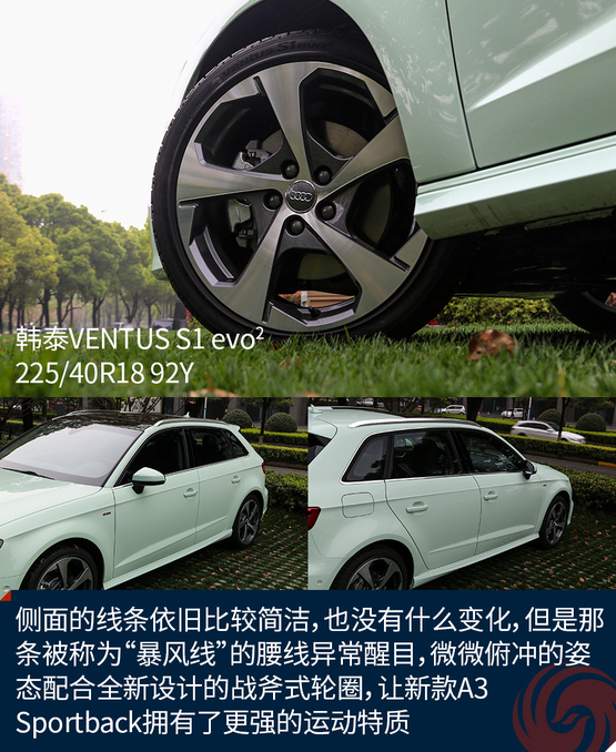 側(cè)面的線條依舊比較簡潔,也沒有什么變化,但是那條被稱為“暴風線”的腰線異常醒目,微微俯沖的姿態(tài)配合全新設計的戰(zhàn)斧式輪圈,讓新款A3 Sportback擁有了更強的運動特質(zhì)。