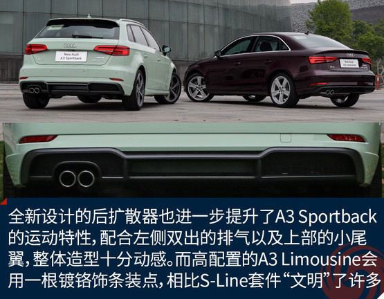 全新設計的后擴散器也進一步提升了A3 Sportback的運動特性,配合左側(cè)雙出的排氣以及上部的小尾翼,整體造型十分動感。而高配置的A3 Limousine會用一根鍍鉻飾條裝點,相比S-Line套件“文明”了許多。與LED矩陣大燈相呼應的是全LED尾燈,兩者相輔相成為新車帶來了更強的攻擊性以及橫向視覺延展性,新加入的流動式轉(zhuǎn)向燈在美觀的同時也提升了整車的科技感。