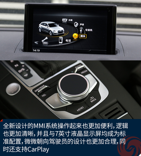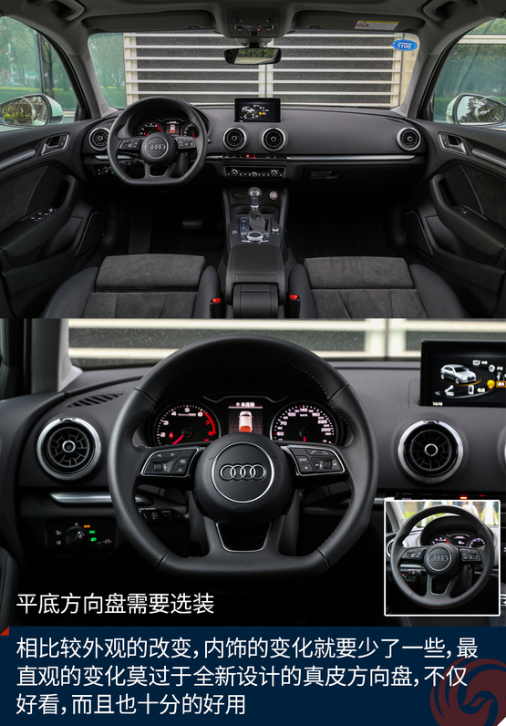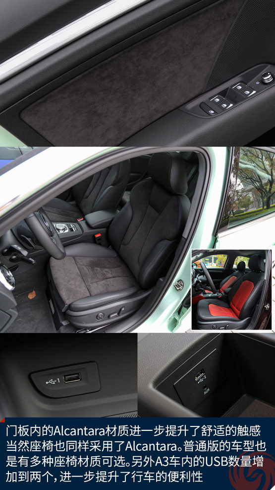 相比較外觀的改變,內(nèi)飾的變化就要少了一些,最直觀的變化莫過于全新設計的真皮方向盤,不僅好看也十分的好用,發(fā)光的迎賓踏板進一步增加了車輛的高級感,中控面板上的鋁合金材質(zhì)的裝飾條質(zhì)感出色,不僅如此,還有多種樣式和材質(zhì)可選;而門板內(nèi)的Alcantara材質(zhì)進一步提升了舒適的觸感,當然座椅也同樣采用了Alcantara。另外新增加的USB接口也進一步增加了行車的便利性,這也讓A3車內(nèi)的USB數(shù)量增加到兩個。同時,全新設計的MMI系統(tǒng)操作起來也更加便利,邏輯也更加清晰,并且與7英寸液晶顯示屏均成為標準配置,微微朝向駕駛員的設計也更加合理,同時還支持CarPlay。