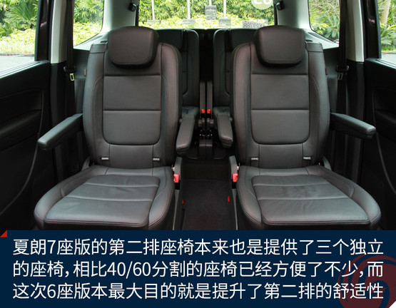 當(dāng)然作為這次新增的車款,我們還是要重點介紹一下夏朗6座版相對于7座版的區(qū)別。首先要說明的是夏朗7座版的第二排座椅本來也是提供了三個獨立的座椅,相比40/60分割的座椅已經(jīng)方便了不少,而這次提供的6座版本最大目的就是提升了第二排乘客的舒適性。