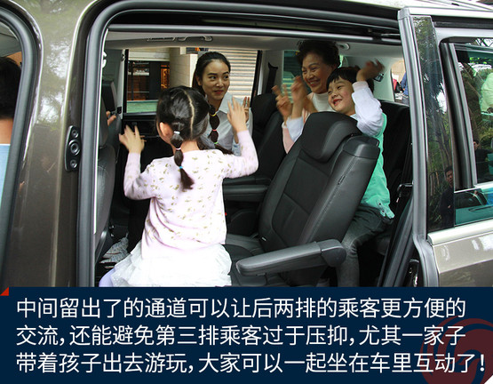 中間留出了的通道可以讓后兩排的乘客更方便的交流,還能避免第三排乘客過于壓抑,尤其一家子帶著孩子出去游玩,大家可以一起坐在車?yán)锘恿耍?/p>