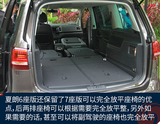 同時,夏朗6座版還保留了7座版可以完全放平座椅的優(yōu)點,后兩排座椅可以根據(jù)需要完全放平整,只不過6座版在第二排中間會有個洞,不像7座版那么完美。另外如果需要的話,甚至可以將副駕駛的座椅也完全放平,將夏朗變成一款“商用車”。