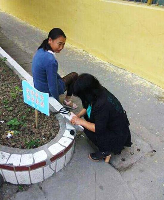 ????近兩天,微信朋友圈流傳一組照片:一位身著黑衣的女子蹲在花壇邊,低頭縫補一只粉色涼鞋(如圖)。旁邊坐著一個小女孩,背過身去拭淚。圖片配文:補鞋的老師像媽媽。這感人一幕發(fā)生在5月21日項城市昌福學(xué)校,該校學(xué)生大部分是留守兒童,補鞋的女子是該校的郭雪梅老師。這件事經(jīng)河南日報客戶端和河南日報官方微博發(fā)布后,在網(wǎng)上引起強烈反響,很多網(wǎng)友表示,這組圖片戳中了心中最柔軟的那一塊。