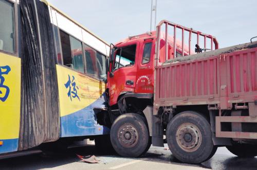 ????????昨日12時許,記者趕到事發(fā)地點(diǎn):渾南西路與沈蘇西路交會處的渾河站橋。只見一輛紅色車身的運(yùn)水罐車與一輛藍(lán)黃相間的大客車相撞!