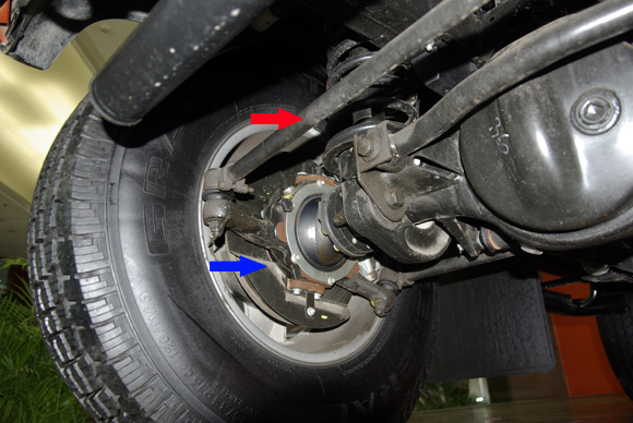 ????后軸特寫圖二,藍(lán)色箭頭所指為拖臂,紅色箭頭所指為后防傾桿,對于衛(wèi)士的車重而已,其粗細(xì)不能提供很好的仿側(cè)傾效果。后軸依然采用螺旋彈簧作為彈性元件。