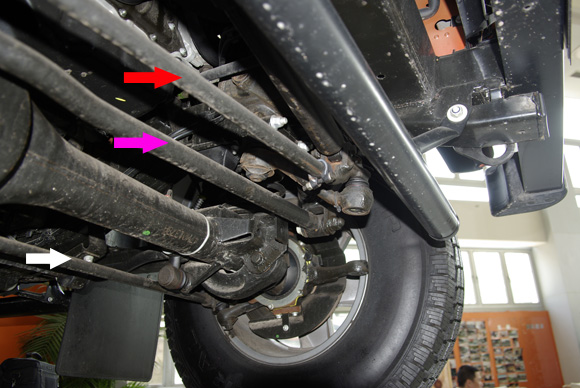 ????前軸特寫二,玫紅色箭頭為橫向推力桿,紅色為轉(zhuǎn)向拉桿,白色的拉桿連接左右的羊角,紅色的轉(zhuǎn)向拉桿帶動衛(wèi)士的右前輪轉(zhuǎn)向,通過白色的拉桿聯(lián)動左前輪,使左右前輪同步的進行轉(zhuǎn)向。