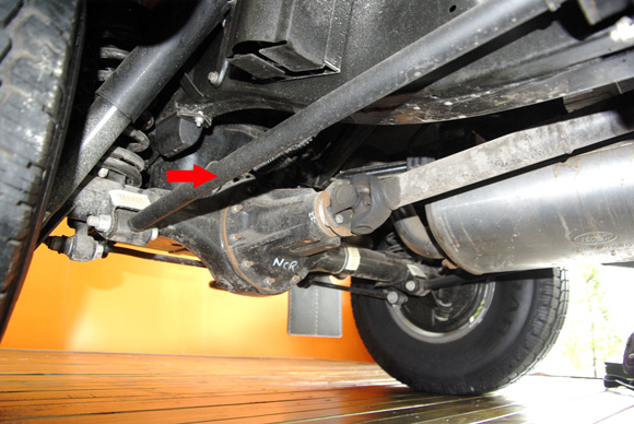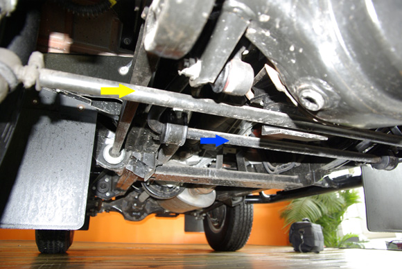 ????上圖中橙黃色箭頭為前軸的限位拉桿,不僅限制前軸自身發(fā)生扭轉(zhuǎn),也可對前軸的相對車架的前后位置進行限制。藍(lán)色箭頭為前防傾桿,目測粗細(xì)并不算大,相信這也跟衛(wèi)士不看重公路性能有關(guān)。