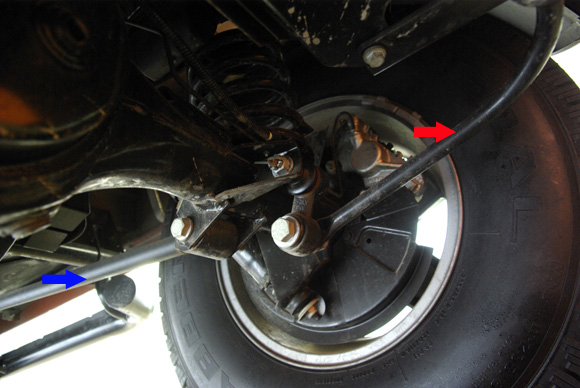 ????衛(wèi)士的后軸采用拖臂式后懸,紅色箭頭所指的拉桿就是拖臂。左右各一根,拖臂及避震機對后軸的自由度進行控制,后軸相對車架的位置和自身的扭轉(zhuǎn)都得到了控制。