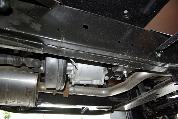 ????衛(wèi)士的大梁及中央差速器特寫,圖中可以看到衛(wèi)士的大梁非常的厚實粗壯。