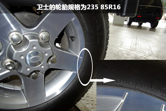 ????衛(wèi)士冰火版的輪胎采用了扁平比厚達(dá)85的輪胎,胎寬為235mm,純粹的越野取向,粗大的輪胎顆??梢詰?yīng)對野外各種地面條件,依然提供可靠的抓地,但面對城市中的柏油路面,則不一定能提供良好的抓地。