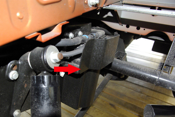 ????細(xì)節(jié)處,剎車的油管外側(cè)有護板(箭頭處)進行周全保護,有效杜絕越野時由車輪攪入的尖銳物體劃傷油管。