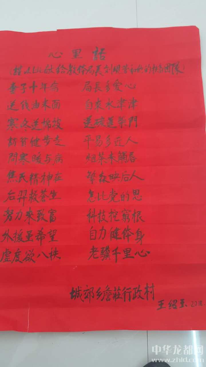 “我推敲了幾個(gè)半夜,寫了《心里話——謹(jǐn)以此獻(xiàn)給教體局局長劉現(xiàn)營和他的扶貧團(tuán)隊(duì)》這首五言排律,表表我和老伴及全村對(duì)您的感激之情?!薄捌拮邮瓴。珠L多愛心。送錢米油面,自來水津津。寒冬送棉被,送炭至柴門。訪貧健步走,平易又近人?!蓖踅B玉聲情并茂地朗讀著,劉局長爽朗地笑了,“老伴劉桂蘭藥按時(shí)吃了嗎?”“按時(shí)吃了,多虧您,到我家宣講扶貧政策,幫助我聯(lián)系有關(guān)單位,我老伴享受了慢性病醫(yī)保?!薄肮鹛m說,人家劉局長隔三差五給咱送米面油,逢年過節(jié)給咱送慰問金,前幾天頂風(fēng)冒雪送來兩床被子,一年不知來了多少趟,待咱比親人還親??!我家也沒有什么拿出手的,我倆一合計(jì),就發(fā)揮我的一點(diǎn)專長,給您寫了首詩,您經(jīng)常去我家噓寒問暖,我今個(gè)也來您這,算是走走親戚吧,回報(bào)回報(bào)您!”