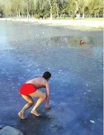 “紅褲頭”小哥脫掉冬衣爬冰救人