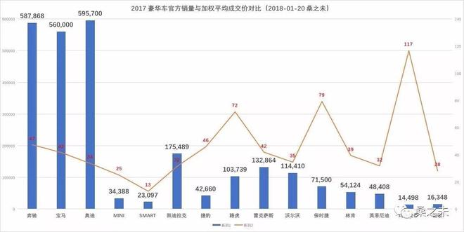 銷售的數(shù)量固然重要,但是銷售質(zhì)量也是評(píng)估銷售力不能忽視的重要指標(biāo)。衡量銷售質(zhì)量,“加權(quán)平均成交價(jià)”和“單車?yán)麧櫋边@兩個(gè)重要參數(shù),也許讓我們更直觀的看到車企的銷售能力與經(jīng)銷商單店經(jīng)營質(zhì)量。這些更微觀的數(shù)據(jù)往往更能反映銷售公司及其經(jīng)銷商體系的銷售能力及水平?!凹訖?quán)平均成交價(jià)”反映車企的產(chǎn)品力與銷售公司的銷售能力,車企賣掉的車越多,單車價(jià)格越貴,品牌就越具有競爭力,反之就需要考慮改進(jìn)產(chǎn)品,提升銷售管理能力?!皢诬?yán)麧櫋敝附?jīng)銷商銷售新車獲取的利潤,不含衍生利潤,一般在-4%-7%之間,如果單車?yán)麧櫝^-2%,廠家需要考慮對(duì)經(jīng)銷商進(jìn)行補(bǔ)貼,如果利潤超過7%,車企就會(huì)調(diào)整經(jīng)銷商浮動(dòng)返利。下面我們通過這兩個(gè)指標(biāo),來看哪些豪華車品牌在2017年表現(xiàn)更具實(shí)力。
