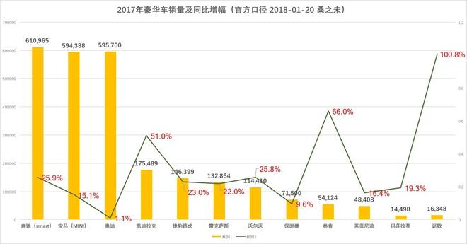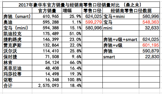 如果以經(jīng)銷商終端零售口徑統(tǒng)計(jì),奔馳(含smart)2017年銷量為624,025輛,其中奔馳品牌(含v級(jí)車)為601,195輛;奧迪品牌為599,279輛;寶馬(含Mini)為580,996輛,其中寶馬品牌為548,363輛;如果以經(jīng)銷商終端零售口徑計(jì)算,奔馳品牌(含v級(jí)車)在2017年豪華車終端零售市場獲得銷售冠軍。