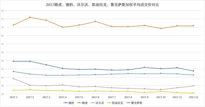 凱迪拉克、捷豹路虎、雷克薩斯、沃爾沃四個(gè)品牌銷量在10萬輛以上為第二陣營。除路虎外,捷豹因進(jìn)口F-pace帶動(dòng)其成交價(jià)上揚(yáng),隨著XE國產(chǎn)上市銷售,捷豹銷量有望進(jìn)一步增長,價(jià)格進(jìn)一步下探;以銷售進(jìn)口車型為主的雷克薩斯,今年銷量質(zhì)量不錯(cuò),庫存時(shí)間短,資金周轉(zhuǎn)快,多數(shù)以訂單方式銷售,加權(quán)平均價(jià)在42萬上下,成交價(jià)格走勢(shì)平穩(wěn),經(jīng)銷商今年利潤也很豐厚。沃爾沃在新款車型的帶動(dòng)下,成交價(jià)格開始上揚(yáng);凱迪拉克今年銷量增速較快,通過下圖我們可以看到,凱迪拉克基本依靠低價(jià)獲取銷量的增長,成交價(jià)格進(jìn)一步走低,經(jīng)銷商的利潤需要依靠廠家補(bǔ)貼。