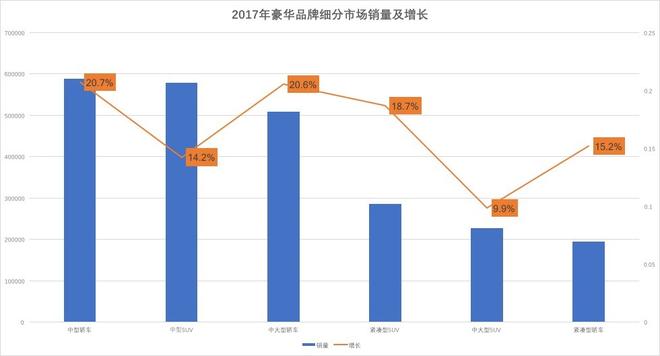 2017年豪華車市場中六大細(xì)分市場(中大型轎車、中型轎車、緊湊型轎車、中大型SUV、中型SUV、緊湊型SUV)占據(jù)豪華車全年93%的銷量,環(huán)比增長17.3%,市場集中度進(jìn)一步提升;豪華車企業(yè)如果想與市場同步增長,就不得不在這個(gè)六個(gè)細(xì)分市場投放車型,并提升產(chǎn)品競爭力。