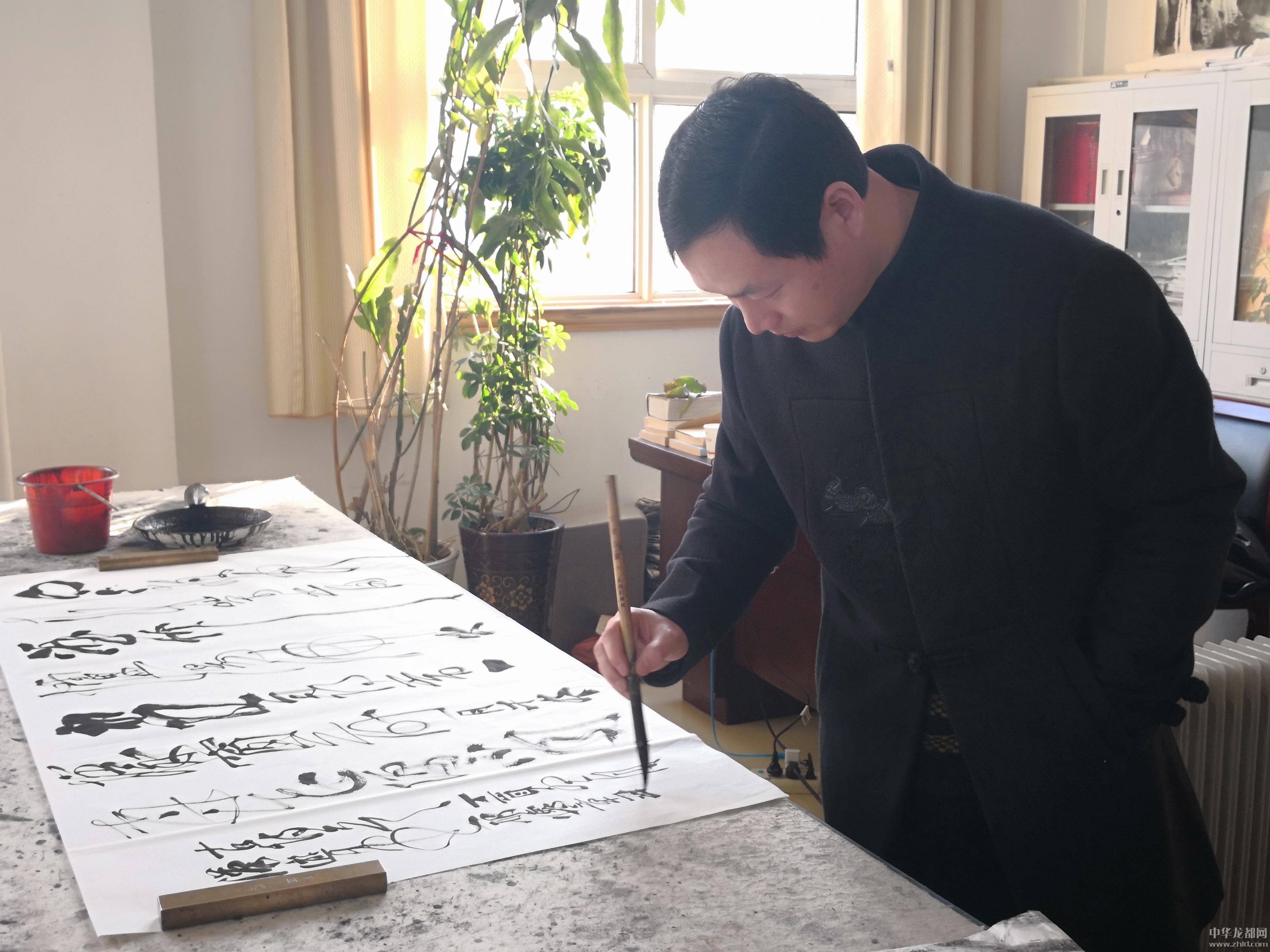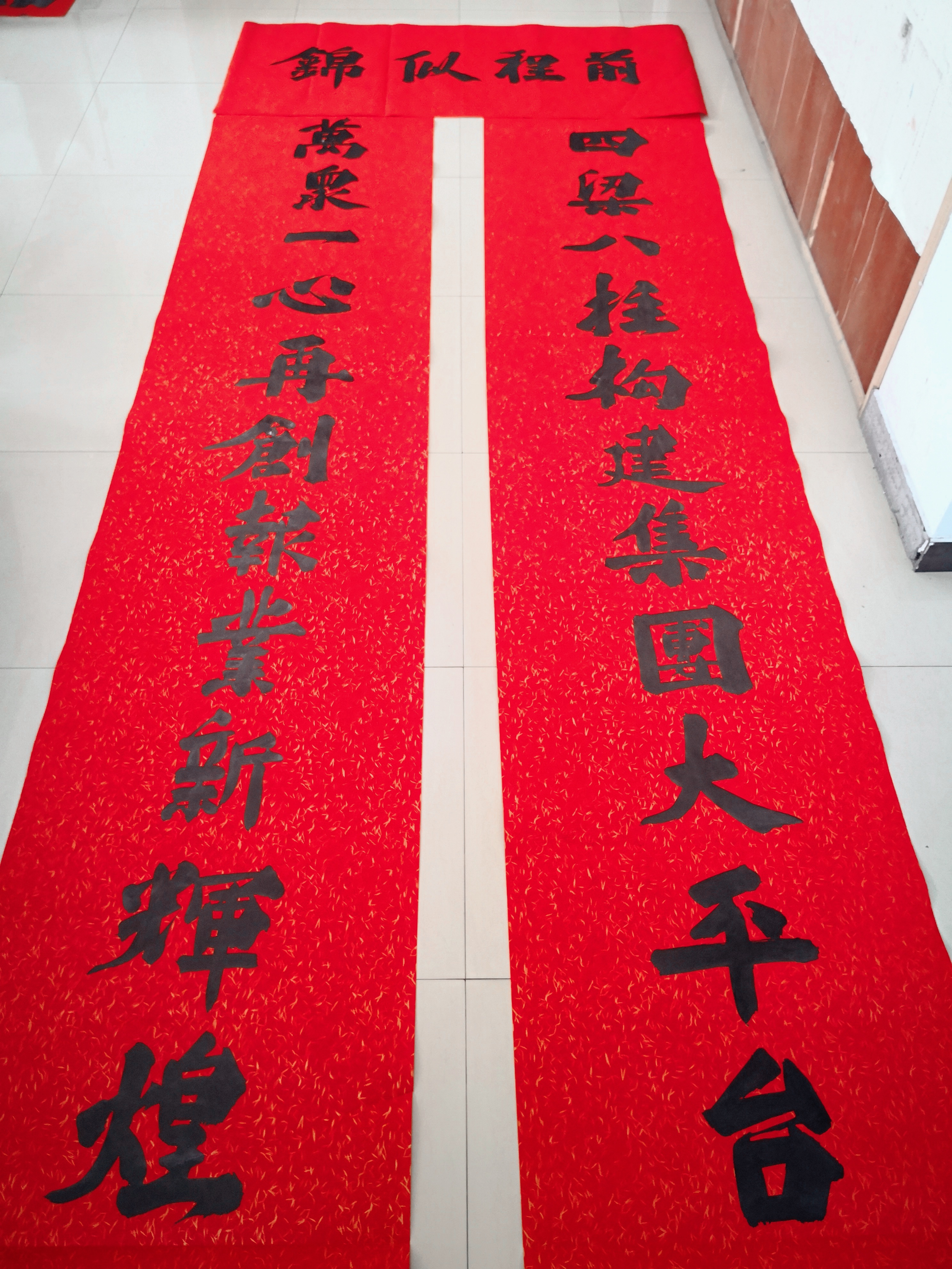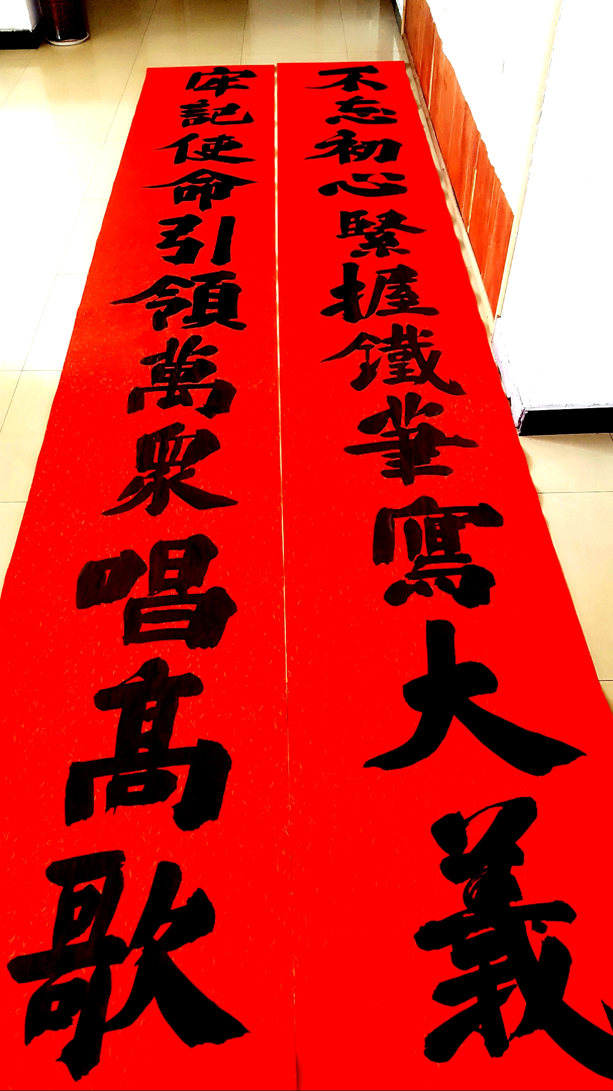 邢懷章以歐陽通筆法融合魏碑,大楷榜書創(chuàng)作而成,春聯(lián)長(zhǎng)達(dá)5米,每字徑80公分左右,一氣呵成,不計(jì)工拙,近兩個(gè)小時(shí)完成兩幅巨型春聯(lián),表達(dá)了對(duì)周口報(bào)業(yè)集團(tuán)的祝福,映出了喜慶的年味。