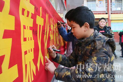 中華龍都網(wǎng)訊(周口報(bào)業(yè)全媒體記者 韋偉 通訊員 王佳佳 辛曼 攝)今年是毛澤東“向雷鋒同志學(xué)習(xí)”題詞55周年。3月5月,沈丘縣紀(jì)委監(jiān)委聯(lián)合縣義工聯(lián)走進(jìn)沈丘二高、河南小學(xué),開展“孝廉文化進(jìn)校園”活動(dòng),旨在弘揚(yáng)雷鋒精神和“孝善儉廉”的美德。圖為:學(xué)生們在“弘揚(yáng)雷鋒精神,做‘孝善儉廉’美德少年”條幅前簽字。