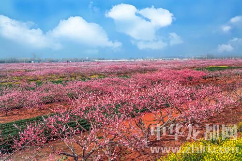 萬畝桃園位于黃橋鄉(xiāng)裴莊村。該村在改革開放前,每人每年只能收獲幾十斤糧食。實(shí)行聯(lián)產(chǎn)承包責(zé)任制后,這個(gè)村依然是“麥茬豆,豆茬麥,改茬就把紅薯栽”。到了1986年底,該村的吳新躍、吳新民、吳新生等6戶村民再也坐不住了,聚在一起商量如何改變傳統(tǒng)的種植模式。最后他們決定在自家責(zé)任田種植桃樹。3年后,6戶村民種的桃樹掛果了,當(dāng)年每戶收入超過2000元。群眾看種植桃樹有利可圖,紛紛效仿,于是以裴莊村為中心的桃樹種植面積越來越大。到2005年,全鄉(xiāng)桃樹種植面積發(fā)展到萬余畝,形成了“春季花滿園,秋季果飄香”的人間仙境。