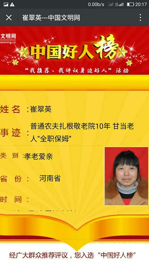 中華龍都網(wǎng)訊(周口報業(yè)全媒體記者馬治衛(wèi))3月30日晚,中國文明網(wǎng)發(fā)布消息:太康縣朱口官路沿村村民、太康縣朱口鎮(zhèn)敬老院院長助理崔翠英入選中國好人榜。