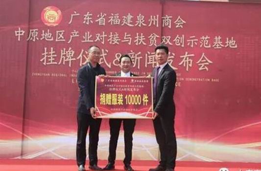 儀式上,廣東省福建泉州商會與香港磊磊集團捐贈服裝10000件,用于啟動扶貧商店。與會領導共同為“廣東省福建泉州商會中原地區(qū)產(chǎn)業(yè)對接與扶貧雙創(chuàng)示范基地”揭牌。隨后,與會人員共同到潤泰紡織、盛宏紡織、萬利源棉業(yè)等企業(yè)進行了參觀,并召開了廣東省福建泉州商會中原地區(qū)產(chǎn)業(yè)對接與扶貧雙創(chuàng)示范基地產(chǎn)業(yè)對接論證座談會。