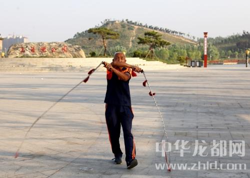 記者在現(xiàn)場看到,切磋技藝的人群中,有甩單鞭、雙鞭的,也有短鞭和長鞭的。鞭友牛紅力起60公斤的大鐵鞭虎虎生威,贏得現(xiàn)場觀眾的喝彩;70多歲的李老漢起雙鞭滾打、跳打花樣十足,一套完整的老子騎牛鞭讓人眼花繚亂,贏得陣陣掌聲。