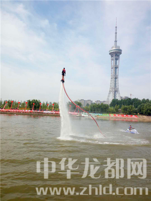 開幕式上,大賽組委會請來的“水上飛人“表演令觀眾驚嘆不已,只見一名運(yùn)動員腳下踩著特制的噴水裝置,猶如鋼鐵俠一般,從水中騰空而起,時而在半空中靜止不動,時而從空中飛魚入水,連續(xù)做出前后空翻、空中回旋、蛟龍出水等各種華麗特技,令觀眾尖叫雀躍。期間,水上兩艘快速疾飛的船模表演,以及空中翻飛自若的航模表演,都給觀眾帶來了不一樣的視覺感受。