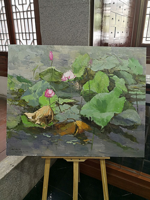 在龍湖荷花盛開的季節(jié),女詩人油畫家三色堇、娜仁琪琪格、愛斐兒、暖玉、白芳芳、劉文文一行6人,來到周口進(jìn)行寫生觀摩,開展老莊文化交流、伏羲太極文化傳播等公益活動。7月17日上午開展女詩人油畫家寫生作品展,豐富多樣的活動成為淮陽荷花節(jié)一濃墨重彩的一筆。