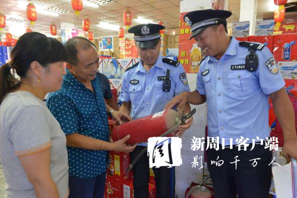 針對高溫天氣火災(zāi)易發(fā)實際,扶溝縣公安局呂潭派出所深入開展火災(zāi)隱患排查整治、消防宣傳教育培訓(xùn),從源頭上消除火災(zāi)隱患。圖為8月13日,民警正在檢查超市消防設(shè)施,講解消防常識。