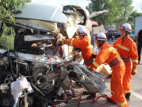 救援人員到達(dá)事故現(xiàn)場后看到,一輛依維柯小型貨車與一輛小型罐車發(fā)生激烈碰撞。小型貨車車頭嚴(yán)重變形,事故現(xiàn)場一片狼藉,玻璃碎片、鐵皮、散落一地,駕駛室內(nèi)司機被牢牢卡在座椅上不能動彈。