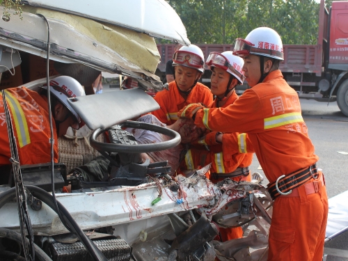 消防官兵一邊對現(xiàn)場進(jìn)行警戒,一邊實施破拆營救。由于車頭嚴(yán)重變形,沒有有利救援支撐的空間,給救援帶來很大的困難。指揮員決定利用機動擴張剪與液壓頂桿對駕駛室進(jìn)行擴張,待撐出有效救援空間后,迅速對被困人員進(jìn)行施救。
