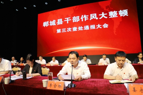 8月15日下午,鄲城縣召開干部作風大整頓第三次查處通報大會。貫徹全市干部作風大整頓查處通報會議精神和縣委十二屆四次全會暨縣委工作會議精神,通報典型案例,宣布處理決定,傳導(dǎo)工作壓力,夯實工作責任,為進一步推進各項工作任務(wù)落實、打好打贏脫貧攻堅戰(zhàn)提供堅強有力的作風保障??h委書記羅文閣發(fā)表講話,縣長李全林主持。全縣副處級以上領(lǐng)導(dǎo)干部和縣、鄉(xiāng)、村各級各部門負責人參會。
