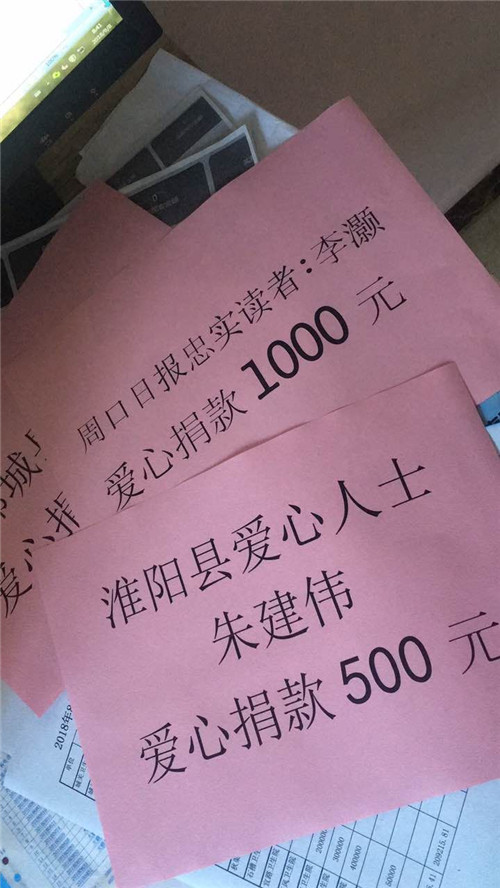 報道發(fā)出后,鄲城縣衛(wèi)計委主任付登霄第一時間作出響應(yīng),批復(fù)2000元錢資助趙家,囑咐駐村干部不能因家庭特困而導(dǎo)致孩子輟學(xué),付登霄表示將長期關(guān)注這個貧困家庭;周口日報忠實讀者李灝遠(yuǎn)在上海,看到報道后立即通過本報記者給趙家匯款1000元;淮陽愛心人士朱建偉愛心捐款500元;寧平鎮(zhèn)中心校正在組織教職員工捐款……