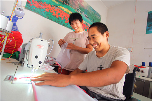 生意閑的時(shí)候,朱建舟又和妻子商量,借錢購(gòu)買了兩臺(tái)縫紉機(jī),幫助附近一家工廠加工環(huán)保袋。加工活雖然不累,但對(duì)于雙腿殘疾的朱建舟來(lái)說(shuō)卻很困難。一向愛(ài)動(dòng)腦筋的朱建舟自己動(dòng)手把縫紉機(jī)踏板改裝成手動(dòng)式的,大大提高了工作效率?!耙粋€(gè)月能掙2000多元錢,還能顧家,照顧病人和孩子?!蓖跷迥菪睦镉姓f(shuō)不出的高興。