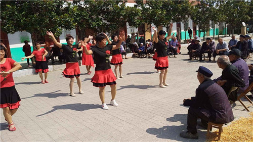 活動現(xiàn)場,隨著婉轉(zhuǎn)悠揚(yáng)的歌曲響起,統(tǒng)一服裝的舞蹈隊阿姨們翩翩起舞,老人們都搬著小板凳圍坐成一圈,氣氛一片祥和。