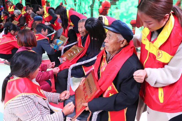 令人感動(dòng)的是,“親情贍養(yǎng)”接父母回家活動(dòng),在晚會(huì)上“原版”呈現(xiàn)。 20多位老人,在子女和20多名志愿者的摻扶下,走上舞臺(tái)。接著子女們飽含深情的舉行了接父母(親人)回家活動(dòng)儀式。20多個(gè)子女向父母行了跪拜磕頭大禮后,起身?yè)肀ё约旱母改覆?duì)父母說(shuō)出爸爸、媽媽“我愛你”時(shí),父母兒女頓時(shí)淚流滿面,臺(tái)上演職人員,臺(tái)下數(shù)千名觀眾情不自禁,潸然淚下。
